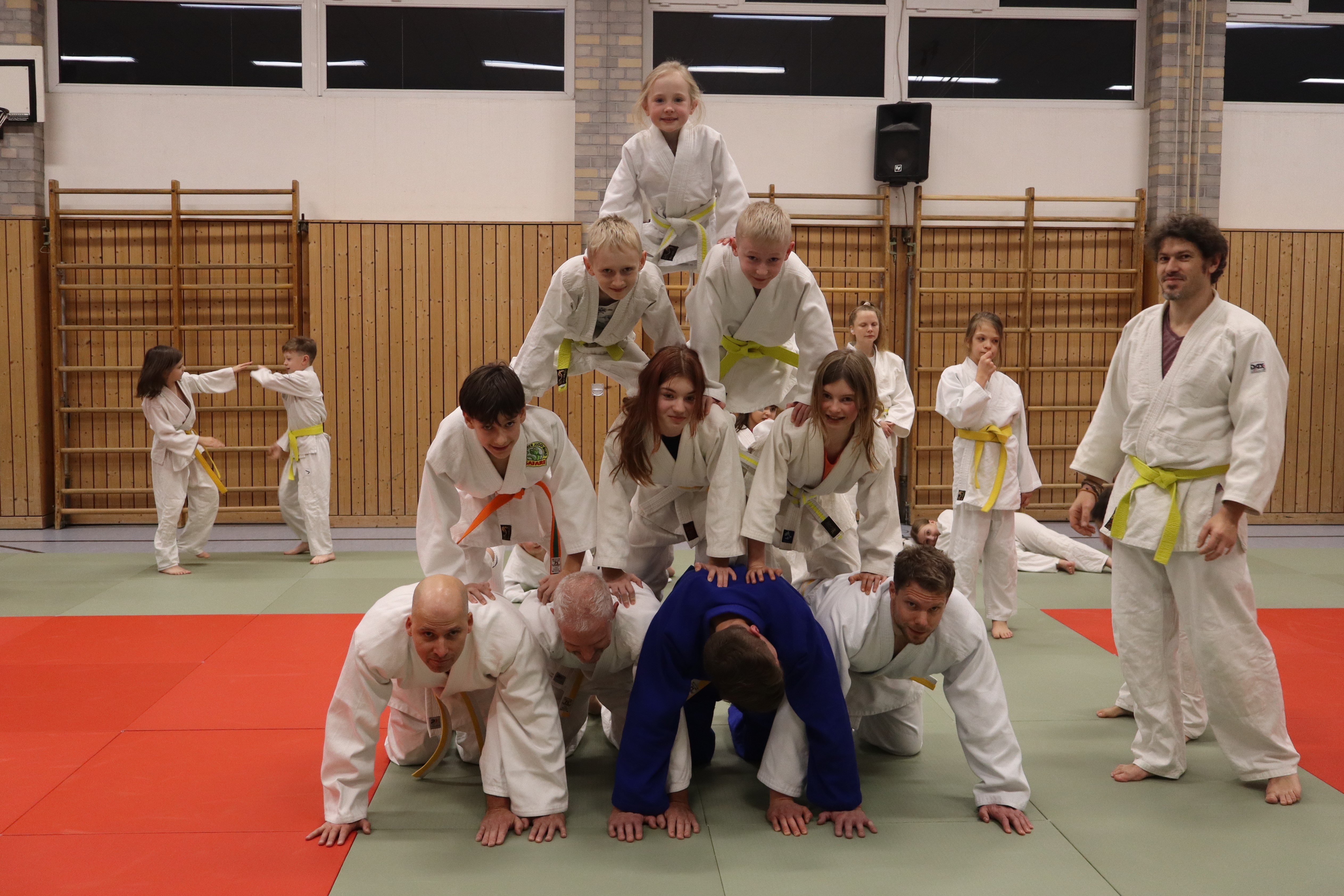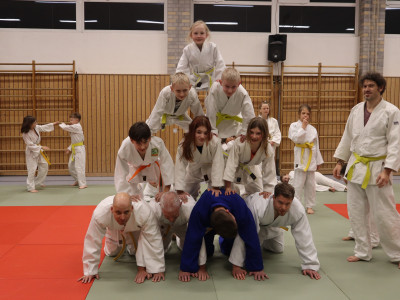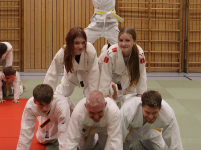 Beim gemeinsamen Weihnachtstraining der ersten und zweiten Trainingsgruppe war die Matte durchgehend voll. Die Altersspanne reichte von vier bis zu über 50 Jahren, Gürtel von weiß über gelb und orange bis hin zu schwarz waren vertreten. Alle hatten viel Spaß bei den gemeinsamen Spielen, bei denen oft Teamgeist und das Zusammenhelfen von Groß und Klein gefragt waren. Auch eine Judo-Einheit durfte nicht fehlen – die SportlerInnen zeigten dem aus Eltern und Verwandten bestehenden Publikum, was sie übers Jahr gelernt hatten. Die Fallschule zur Seite und nach hinten beherrschten alle schon fast perfekt, und auch mehrere Würfe und Haltegriffe standen auf dem Programm. Zum Abschluss bauten alle zusammen große Menschenpyramiden – gar nicht so einfach, denn viel Gleichgewicht und Zusammenhalt waren nötig. Trotzdem meisterten die Judoka die Herausforderung mit Bravour.