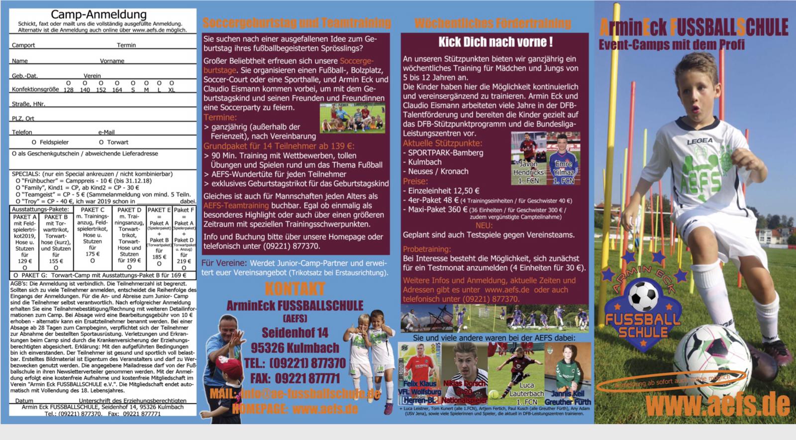 Der SC Eschenbach veranstaltet in Zusammenarbeit mit der ArminEck FUSSBALLSCHULE ein Fußballcamp für Nachwuchskicker und -kickerinnen der Region. Übersteiger, Zidane-Drehung, Crossover und andere tolle Finten warten auf alle fußballbegeisterten Kinder zwischen 5 und 15 Jahren, die vom 5. bis 7. Juli mit Armin Eck und seinem Trainerteam drei besondere Fußballtage erleben möchten.